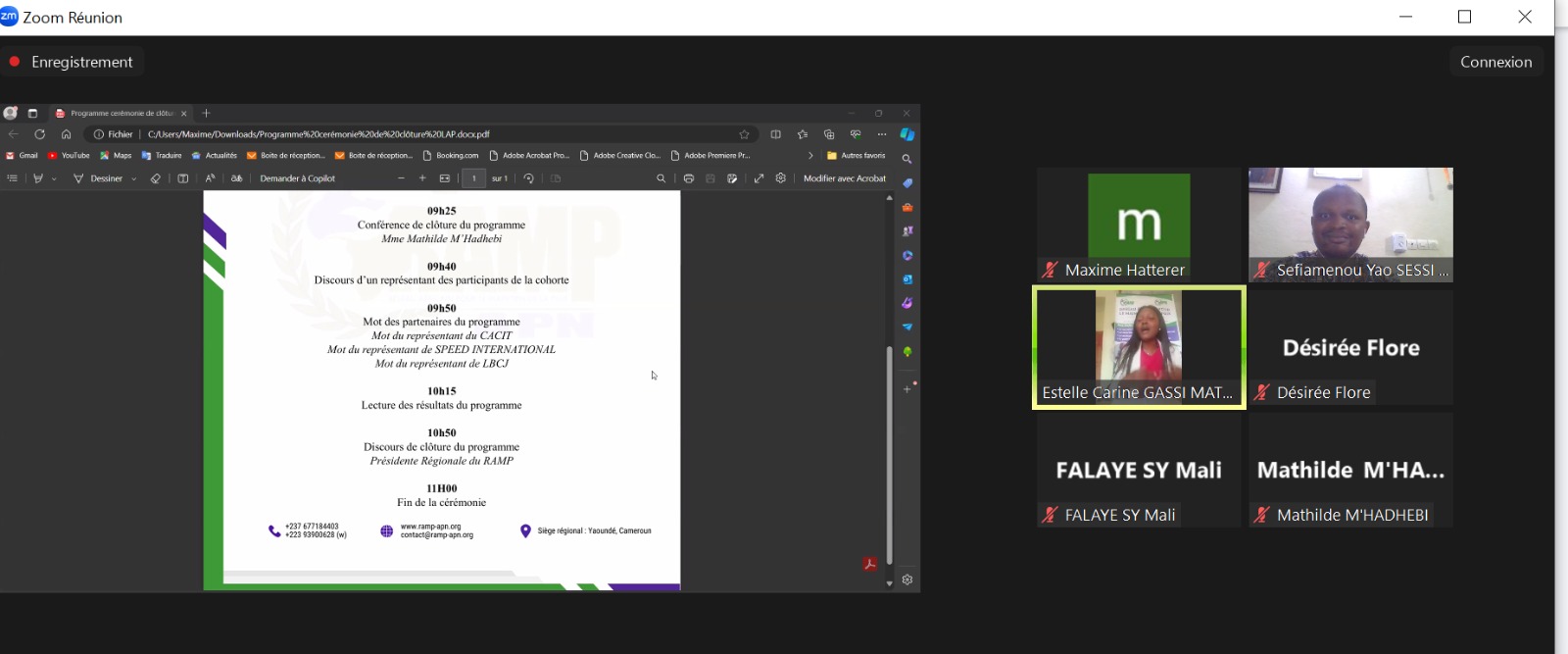 La cérémonie de clôture a débuté à 9h et la modération du jour était assurée par Monsieur Maxime Hatterer, conférencier et membre expert du RAMP. La cérémonie a débuté par la conférence de clôture de Mme Mathilde M’Hadhebi, juriste franco-tunisienne et consultante juridique au RAMP. Cette intervention a été suivi par un exposé qui portait sur le thème de la journée mondiale de l’Afrique, présenté par le Professeur Fofack Eric Wilson, Dirécteur exécutif du centre pour le genre, la paix et la sécurité (CGEPS).