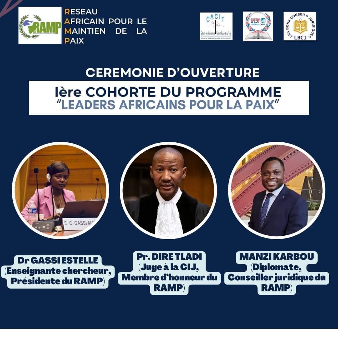 La cérémonie d’ouverture du lancement officiel du Programme « Leader Africain pour la Paix » en abrégé LAP a eu lieu le mercredi 13 mars 2024 à partir de 15h GMT sous la direction de la Présidente régionale du RAMP, Dr. Gassi Estelle et en présence du Prof. Dire Tladi, Juge à la Cour Internationale de Justice – membre d’honneur du RAMP ainsi que de M. Manzi Karbou, Diplomate – Conseiller juridique du RAMP.